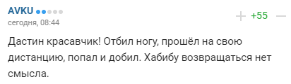 "Дастін красавчик! Відбив ногу, пройшов на свою дистанцію, влучив і добив. Хабібу повертатися немає сенсу".