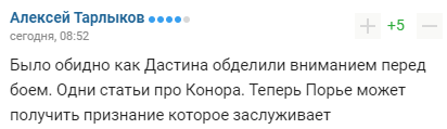 "Було прикро як Дастіна обділили увагою перед боєм. Одні статті про Конора. Тепер Пор'є може отримати визнання, яке заслуговує".