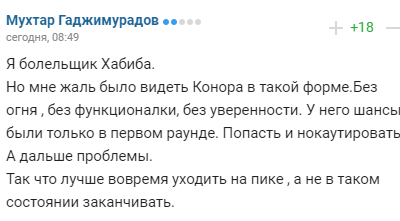 Я вболівальник Хабіба. Але мені шкода було бачити Конора в такій формі. Без вогню, без функціоналки, без впевненості. У нього шанси були тільки в першому раунді. Влучити і нокаутувати. А далі проблеми. Так що найкраще вчасно піти на піку, а не в такому стані закінчувати".