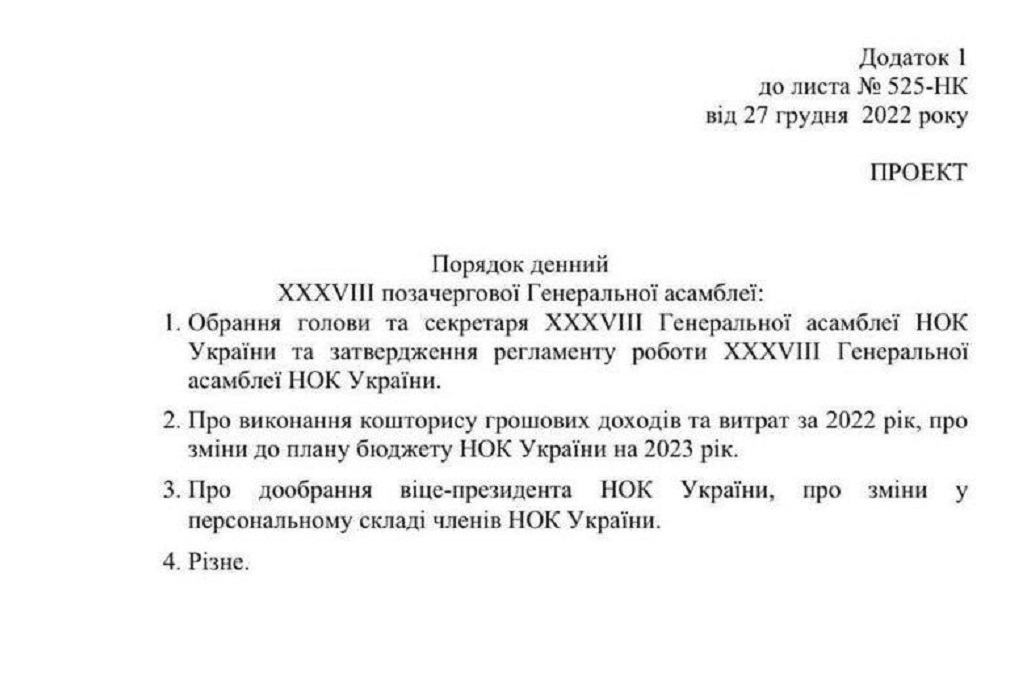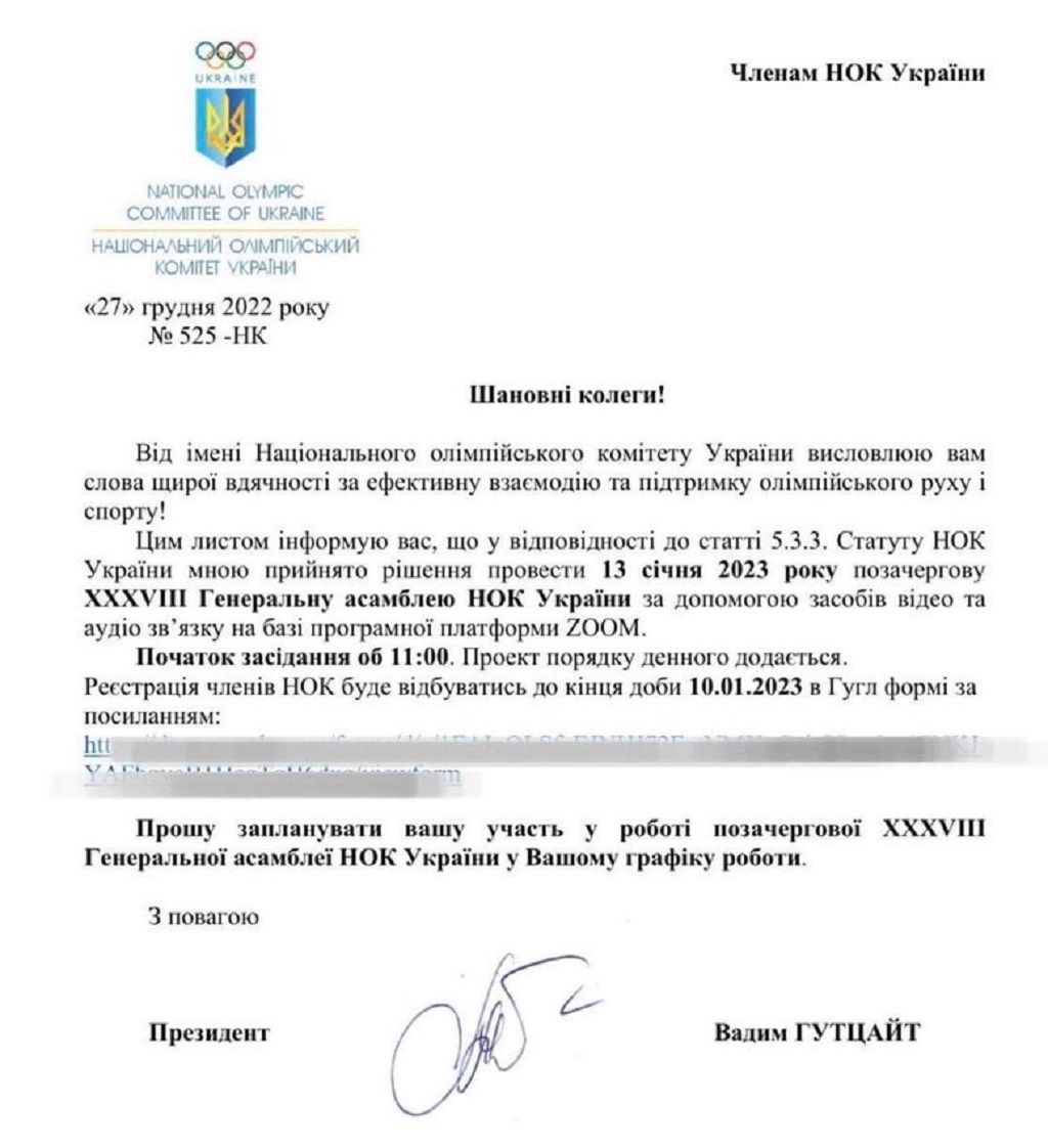 "Цим листом інформую Вас, що відповідно до статті 5.3.3. Статуту НОК України мною прийнято рішення провести 13 січня 2023 року позачергову XXXVIII Генеральну асамблею НОК України за допомогою засобів відео- та аудіозв'язку на базі програмної платформи ZOOM", - йдеться у документі.