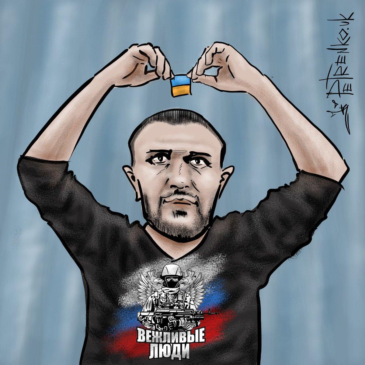 Так, на малюнку зображений український боксер Ломаченко, який тримає над головою маленький прапор України. При цьому на грудях у спортсмена зображений боєць російського спецназу, під яким написано "ввічливі люди".