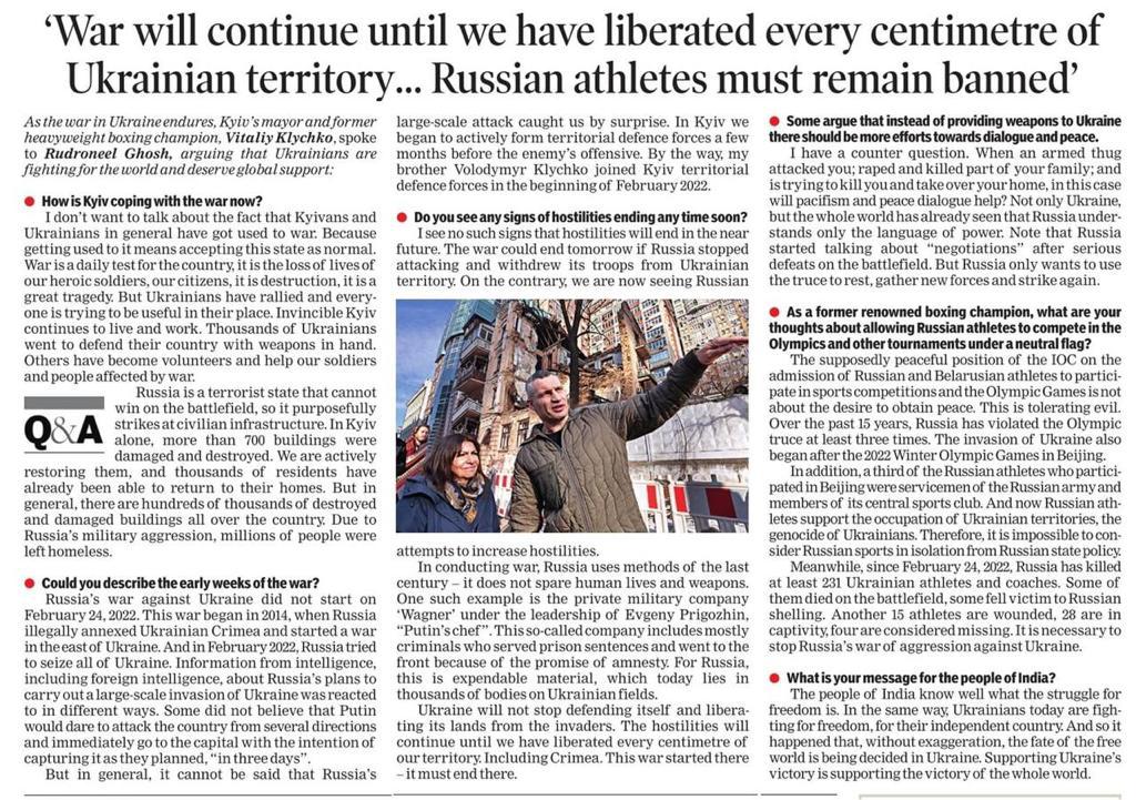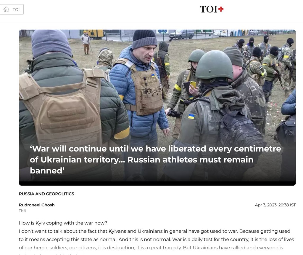 Про це заявив мер Києва Віталій Кличко в інтерв"ю одній з найбільших газет Індії "The Times of India", яке вийшло під заголовком: "Війна триватиме, доки ми не звільнимо кожен сантиметр української території… Російські спортсмени мають залишатися під забороною".