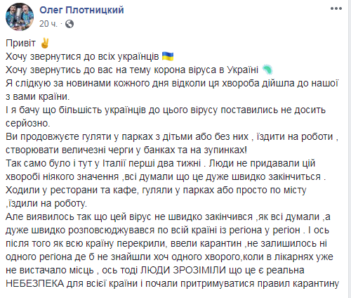 "Невже так складно посидіти вдома два-три тижня, перечекати, приділити дітям більше уваги, відпочити, добре поспати або використовувати час для того, що ви хотіли б зробити вдома, але через роботу не могли? Я прошу всіх поставитись до цієї ситуації серйозно і з відповідальністю. Залишайтеся вдома, виходьте на вулицю тільки для того, щоб: купити їжі, прогулятися максимум хвилин 15-20 і то біля будинку і бажано не з друзями або компанією, сходити в аптеку. Давайте зроби так, щоб не було пізно, як в Італії чи Китаї", - додав Плотницкий.