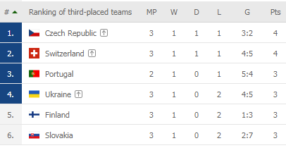 З 3 місць в плей-офф також вийшли Швейцарія (група А) і Чехія (група D). Четвертою командою може стати збірна, яка займе 3 місце в групі F. В даний час на третьому місці Португалія, але в разі поразки з великим рахунком у матчі з Францією португальці не вийдуть в плей-офф, а замість них путівку в плей-офф отримає Фінляндія, яка посіла третє місце в групі В. Втім, даний момент малоймовірний.