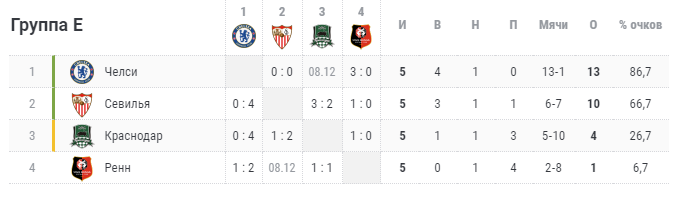 "Челсі" і "Севілья" вийшли в плей-офф, посівши перше і друге місце відповідно. "Краснодар" виходить в Лігу Європи, "Ренн" припиняє виступи в єврокубках. Матчі останнього туру вже нічого не вирішують.