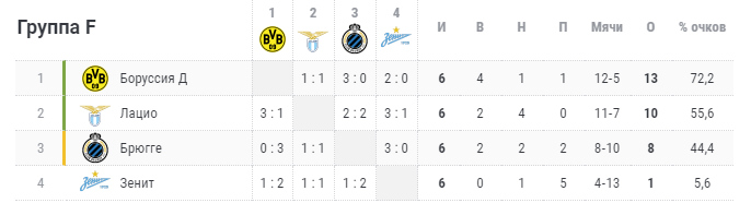 Дортмундська "Боруссія" програла в першому турі, але потім набрала 13 очок в п'яти матчах і виграла групу. "Лаціо" лише в останньому турі гарантував собі друге місце. "Брюгге" зіграє в Лізі Європи, а чемпіон Росії "Зеніт" з ганьбою посів останнє місце, набравши всього одне очко.