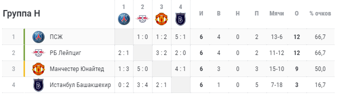 ПСЖ посів перше місце, хоча після трьох турів в активі французького клубу було всього три очки. Втім, у другому колі парижани виграли всі три матчі і посіли перше місце. Другу путівку до плей-офф несподівано завоював "РБ Лейпциг", який у вирішальному матчі переміг "Манчестер Юнайтед". Для манкуніанців вирішальною виявилася сенсаційна поразка від аутсайдера групи "Істанбул Башакшехір".