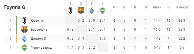 "Ювентус" в останньому турі випередив "Барселону" в боротьбі за перше місце за результатами особистих зустрічей (0:2 і 3:0). "Динамо" у вирішальному матчі переграло "Ференцварош", який тренує українець Сергій Ребров, і продовжить виступи в Лізі Європи.