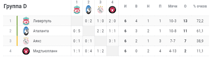 "Ліверпуль" досить впевнено виграв групу, програвши лише один матч. "Аталанта", за яку виступає українець Руслан Малиновський, в останньому турі обіграла "Аякс" і забезпечила собі друге місце. "Аякс" відправився в Лігу Європи.