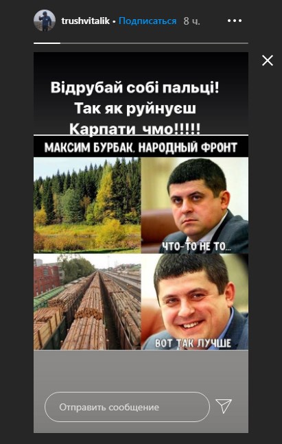 Труш розмістив фото Бурбака на тлі вирубаних дерев. У коментарі до знімка він написав: "Відрубай собі пальці! Так, як ти руйнуєш Карпати, чмо".