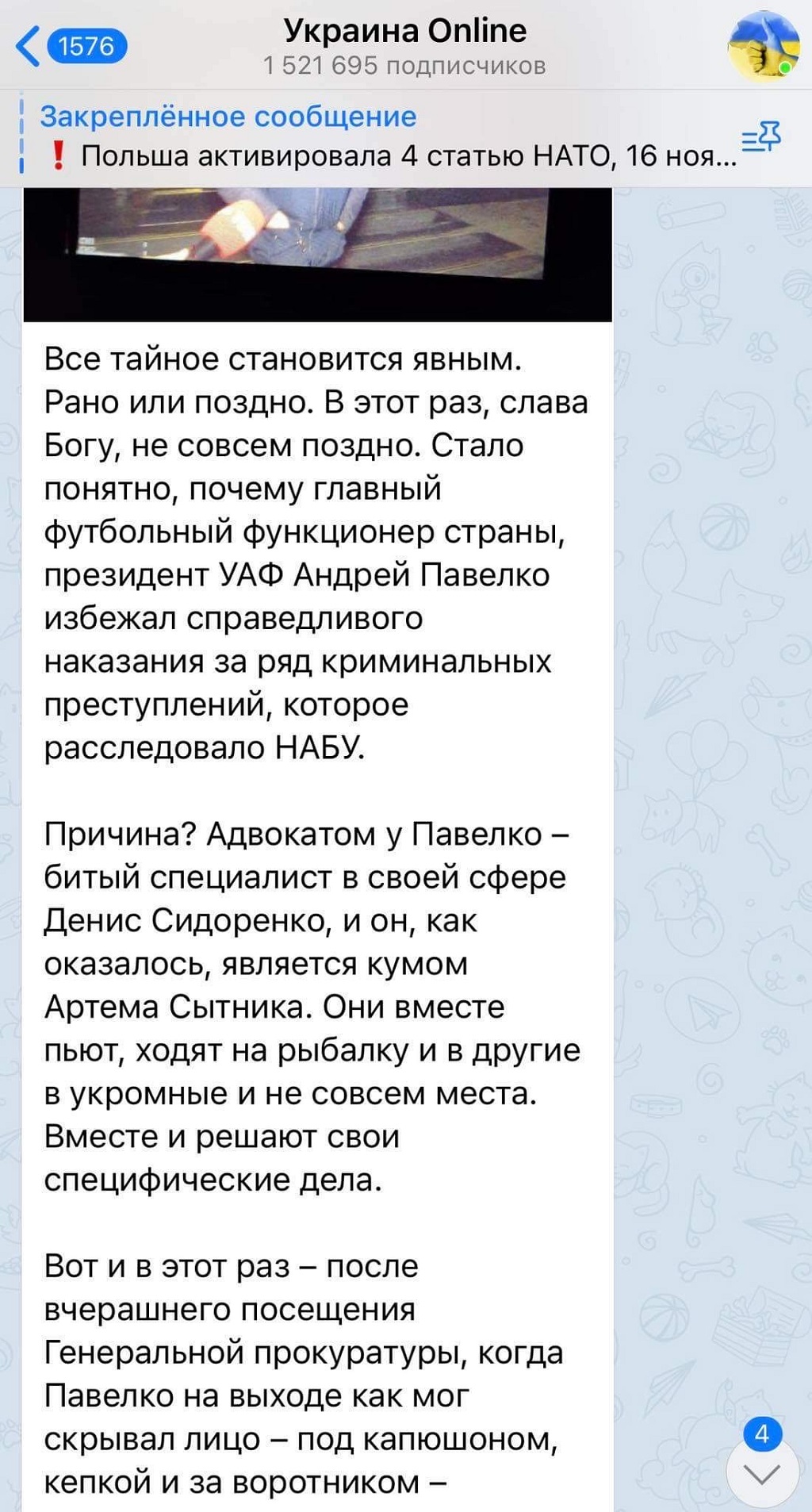 "Продовження історії з врученням ухвали генсеку УАФ Запісоцькому, яку Протасов та Дем'яненко назвали роботою російських спецслужб. Тепер проти Павелка явно замовили антипіар-компанію - його мочать в анонімних тг-каналах, а там такі пости точно коштують дуже недешево", - зауважував тоді Сажко.