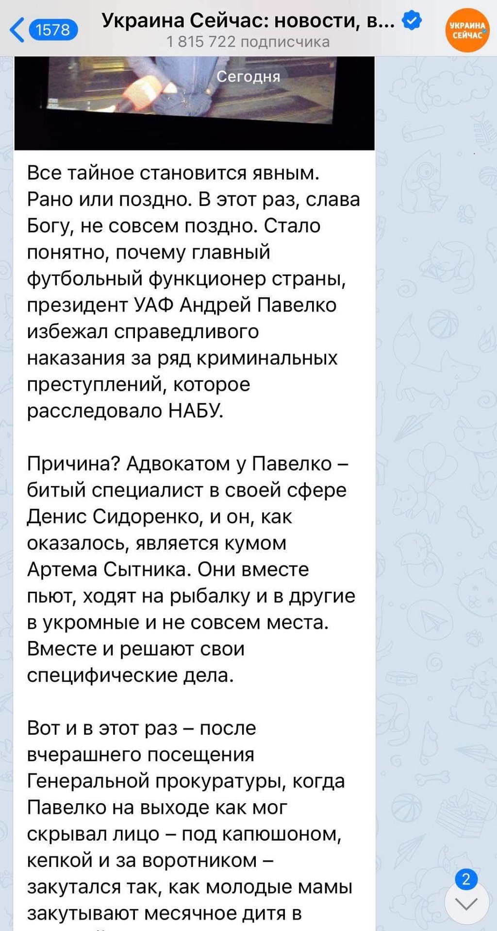 В межах кампанії з дискредитації керівника УАФ Андрія Павелка вже не вперше були використані анонімні телеграм-канали - мільйонники. Порція дописів з"явилася на другий день після вручення Павелку повідомлення про підозру та присвячена спробі дискредитувати його адвокатів.