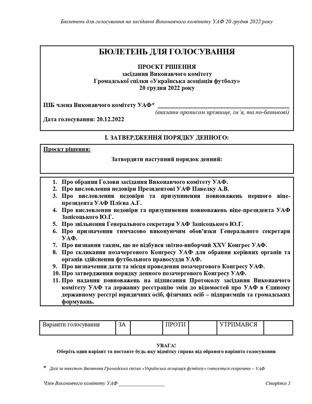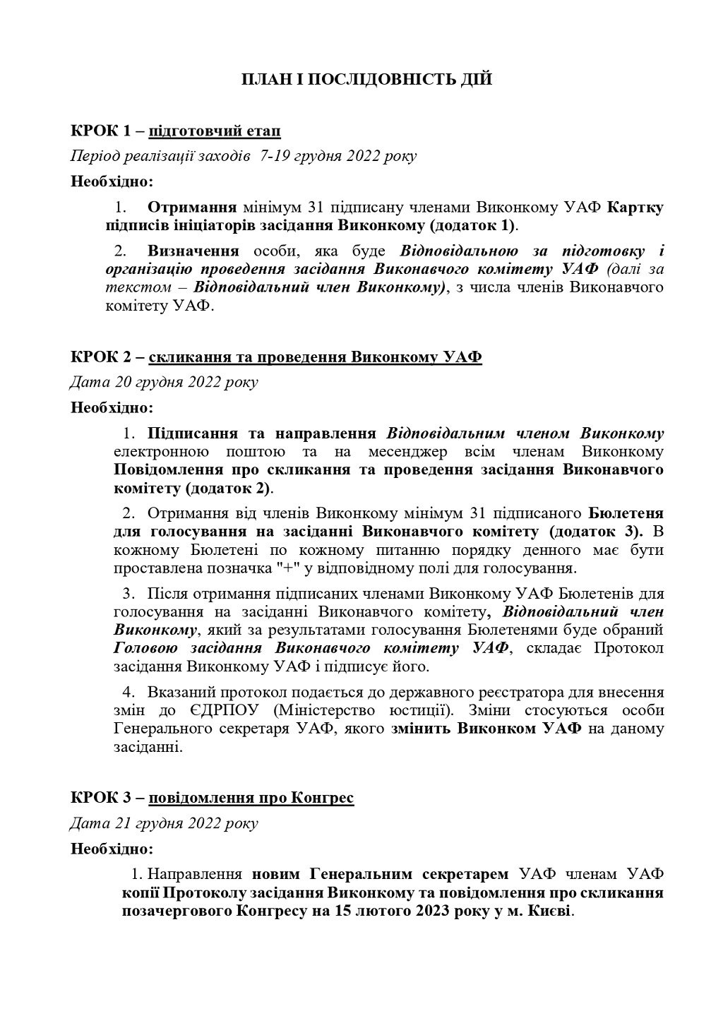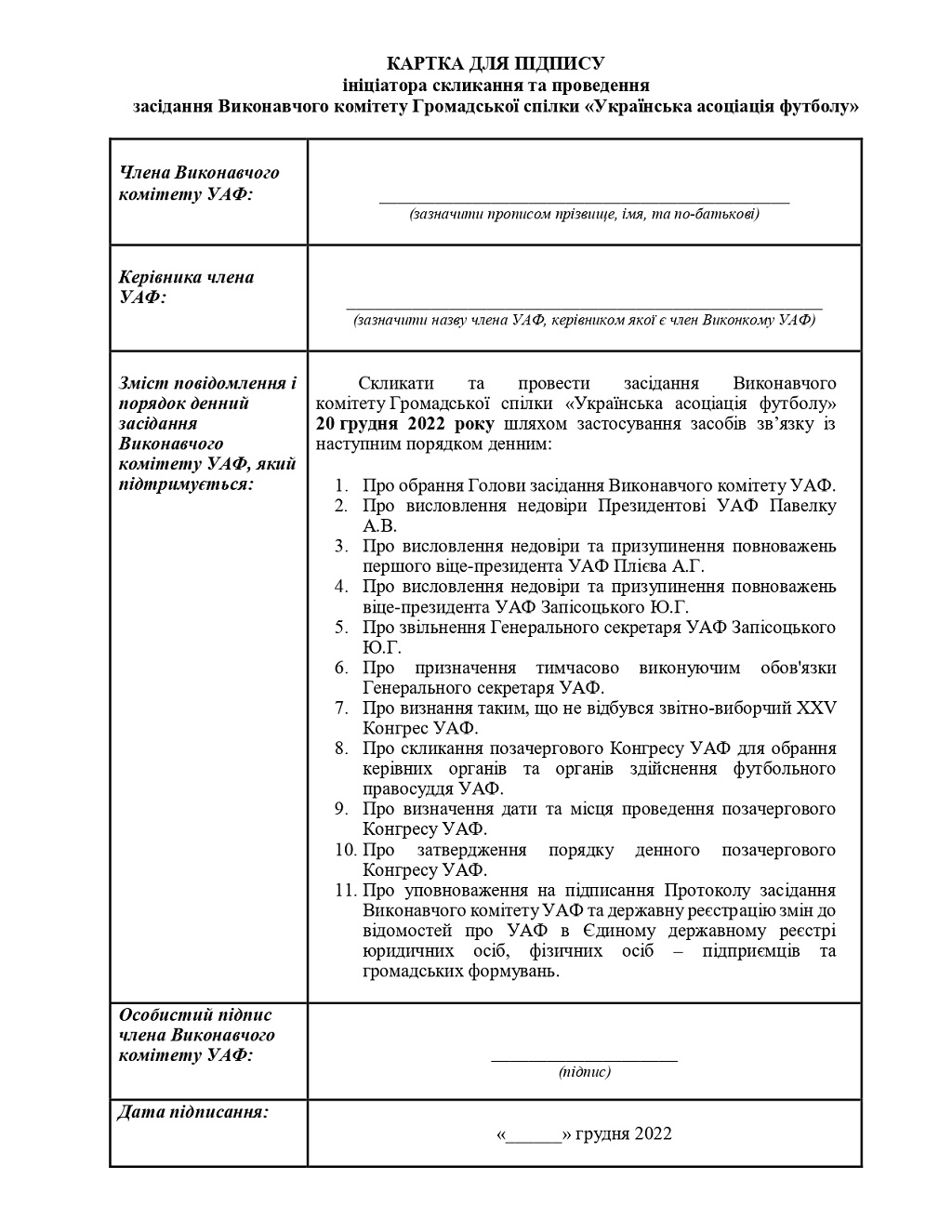 "Пам"ятаєте, раніше я розповідала про те, як шість голів обласних асоціацій писали в кабінетах голів військових адміністрацій і під копірку протоколи про скликання позачергового конгресу УАФ на 20 грудня. Так ось, нічого у них не вийшло. Тому відбувається спроба №2 щодо відсторонення керівництва УАФ під кодовою назвою ВІРТУАЛЬНИЙ ВИКОНКОМ.Усім членам Виконкому був розісланий план дій щодо скликання та проведення віртуального Виконкому УАФ!За задумом керівників диверсійної групи для проведення конгресу потрібний підпис 31 члена Виконкому. Далі за схемою в кожному Бюлетені має бути проставлена позначка "+" навпроти графи", - написала вона, опублікувавши "план дій" та розроблений під нього проект бюлетеня.