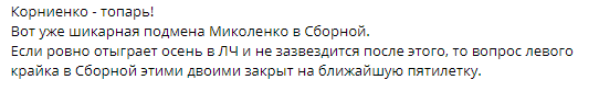 "Корнієнко - топ! Ось вже шикарна підміна Миколенко в збірній. Якщо рівно відіграє осінь в ЛЧ і не зазнається після цього, то питання лівого крайка в збірній цими двоімі закрите на найближчу п'ятирічку".