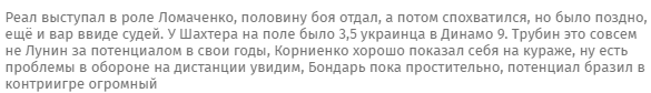 "Реал" виступив в ролі Ломаченко, половину бою віддав, а потім схаменувся, але було пізно, ще й VAR у вигляді суддів. У "Шахтаря" на поле було 3,5 українця, в "Динамо" - 9. Трубін - це зовсім не Лунін за потенціалом в свої роки, Корнієнко добре показав себе на куражі, але є проблеми в обороні, на дистанції побачимо, Бондар поки можна пробачити, потенціал бразильців в контргрі величезний".