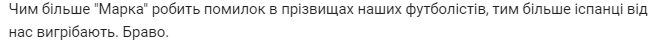 "Чим більше" Марка "робить помилок в прізвищах наших футболістів, тим більше іспанці від нас вигрібають. Браво".