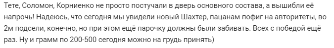 "Тете, Соломон, Корнієнко не просто постукали в двері основного складу, а вибили її геть! Сподіваюся, що сьогодні ми побачили новий "Шахтар", пацанам пофіг на авторитети, у 2-му підсіли, звичайно, але при цьому ще парочку повинні були забивати. Всіх з перемогою ще раз. Ну і грам по 200-500 сьогодні можна на груди прийняти ", - пишуть користувачі.