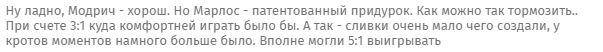 "Ну ладно, Модріч - хороший. Але Марлос - патентований придурок. Як можна так гальмувати .. За рахунку 3:1 куди комфортніше грати було б. А так - "вершки" дуже мало чого створили, у "кротів" моментів набагато більше було. Цілком могли 5:1 вигравати ".