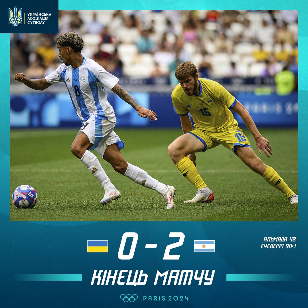 Українська збірна під час вирішального матчу групового етапу футбольного турніру поступилася Аргентині 0:2 і вибула з Олімпійських ігор 2024.