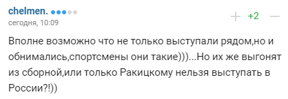 "Цілком можливо, що не тільки виступали поруч, але і обіймалися, спортсмени вони такі))). Але їх же виженуть зі збірної або тільки Ракицькому не можна виступати в Росії?!))"