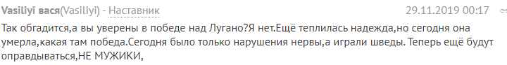 "Так обгадилися, а ви впевнені в перемозі над Лугано? Я нет. Ще була надія, але сьогодні вона померла, яка там победа.Сегодня було тільки порушення, нерви, а грали шведи. Тепер ще будуть виправдовуватися, НЕ МУЖИКИ".