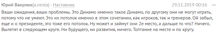 "Ваші очікування, ваші проблеми. Це Динамо саме таке Динамо, інакше вони не можуть грати, тому що не вміють. Це їхня стеля саме в цьому поєднанні, як гравців, так і тренерів. Ой забув, ще й про президента, це теж його стелю. Ну може і займуть вони 2е місце, а далі то що? нічого. вильоту в наступному колі. ні майбутнього, ні розвитку, нічого. Топтання на місці і по колу ", - пишуть користувачі.