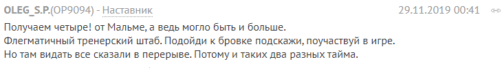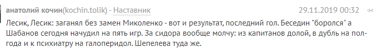 "Лесик, Лесик: заганяв без замін Миколенко - ось і результат, останній гол. Бесєдін "боровся", а Шабанов сьогодні начудив на п'ять ігор. За Сидора взагалі мовчу: з капітанів геть, в дубль на пів-року і до психіатра на галоперидол. Шепелєва туди ж".