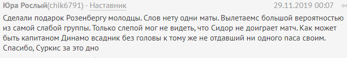 "Зробили подарунок Розенбергу молодці. Слів немає одні матюки. Вилетаемс великою ймовірністю з найслабшою групи. Тільки сліпий міг не бачити, що Сидор НЕ дограє матч. Як може бути капітаном Динамо вершник без голови до того ж не віддав жодного пасу своїм. Дякую, Суркіс, за це дно".