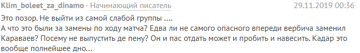 "Це ганьба. Не вийти з найслабшою групи... А що це були за заміни по ходу матчу? Чи не найнебезпечнішого попереду Вербича замінив Караваєв? Тому не випустити де пену? Він і пас віддати може і пробити і навісити. Кадар це взагалі цілковите дно ...".