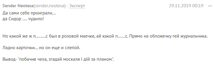 "Так самі собі програли .... да Сидор .... чуділо! Але який же ж п ........ з був у рожевій маєчці, ай який п ...... с. Прямо на обложечку гей журналу. Гаразд картки ... але він ще і сліпий. Висновок-"Побачив чеха, Згадай москаля и Дій за планом".