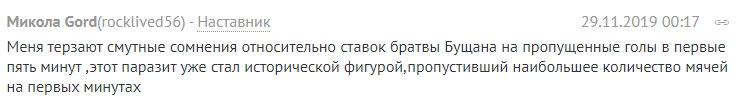 "Мене мучать сумніви щодо ставок братви Бущана на пропущені голи в перші п'ять хвилин, цей паразит вже став історичною постаттю, який пропустив найбільшу кількість м'ячів на перших хвилинах".