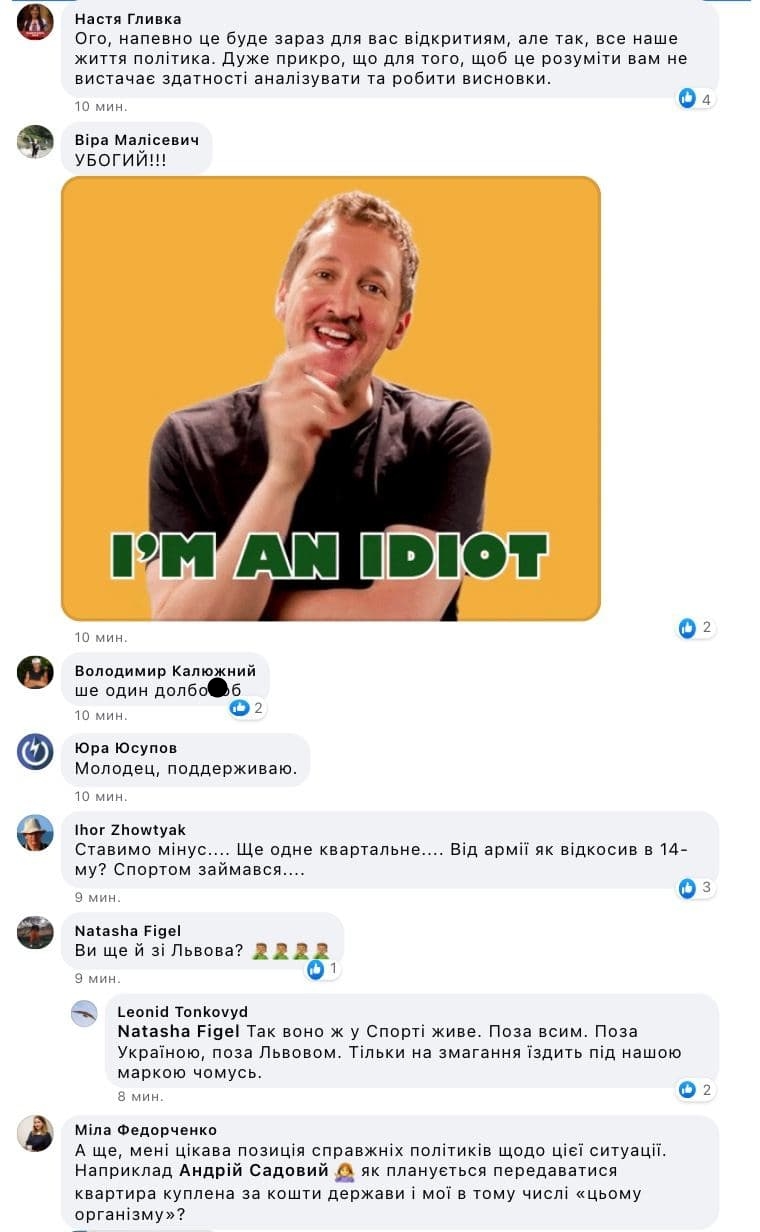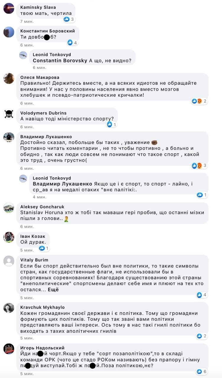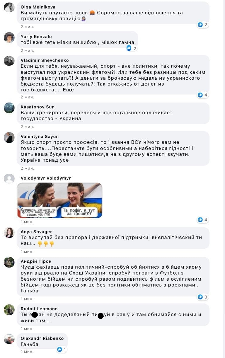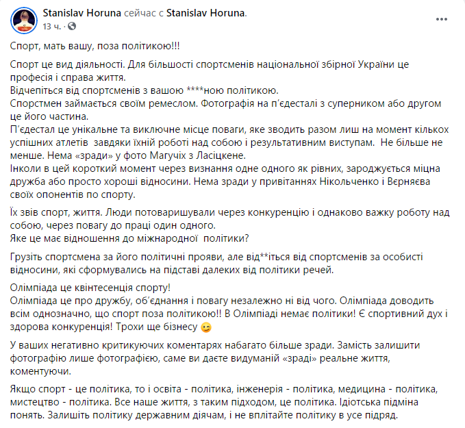 "Спорт, мать вашу, поза політикою !!! Спорт це вид діяльності. Для більшості спортсменів національної збірної України це професія і справа життя. Відчепіться від спортсменів з вашою **** ною політикою. Спорстмен займається своїм ремеслом. Фотографія на п'єдесталі з суперниками або другом це його частина ", - написав каратист.