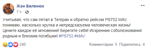 "З огляду на те, що сам літав в Тегеран і назад рейсом PS752 МАУ, розумію, наскільки крихке і непередбачуване людське життя! Цінуйте кожну її мить! Бережіть себе! Щирі співчуття рідним і близьким загиблих! # PS752 # МАУ", - написав у своєму Facebook борець і депутат Жан Беленюк.