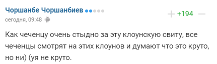 "Як чеченцю дуже соромно за цю клоунську свиту, все чеченці дивляться на цих клоунів і думають що це круто, але ні) (уя не круто".