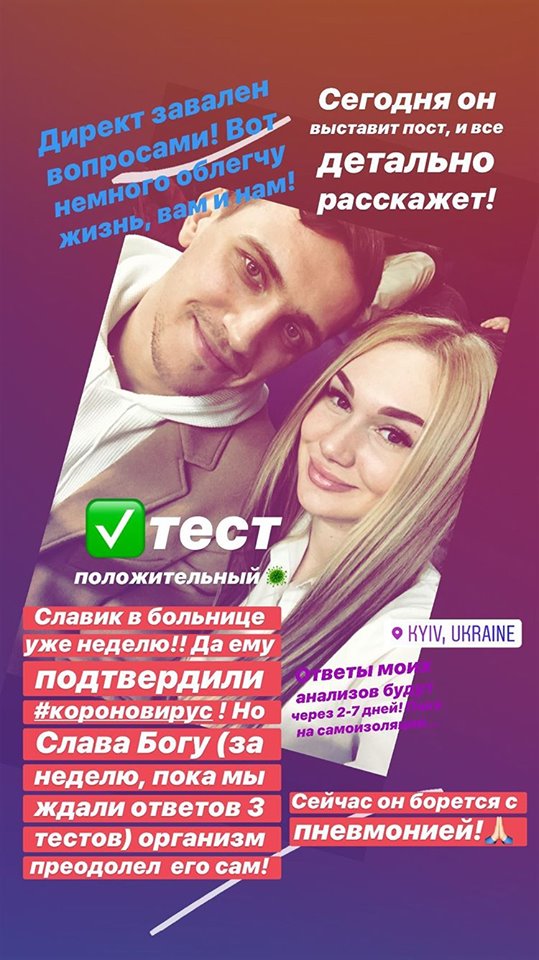 "Тест позитивний. Славик в лікарні вже тиждень! Так, йому підтвердили коронавірус. Але, слава Богу (за тиждень ми чекали відповідей 3 тестів) організм подолав його сам! Зараз він бореться з пневмонією!