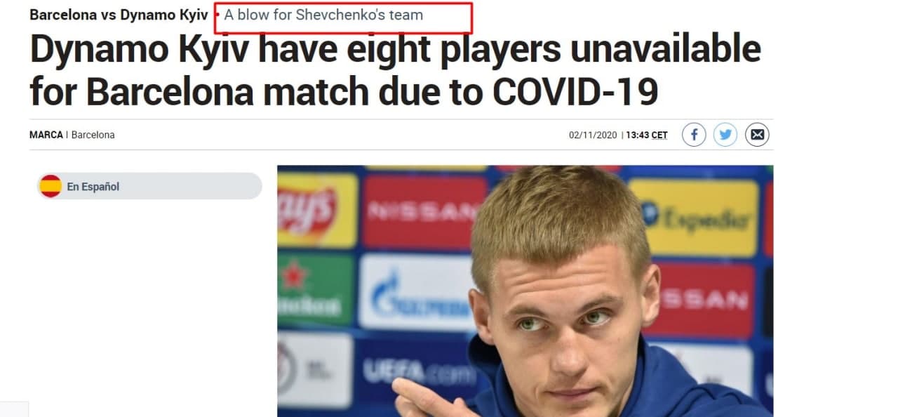 Іспанське видання Marca назвало головного тренера збірної України Андрія Шевченка наставником київського "Динамо" в замітці про майбутній матч між українським клубом і "Барселоною" в 3-му турі групового турніру Ліги чемпіонів.