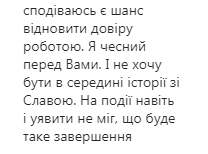 "В чому дно? Що я не хочу бути в історії, яка зі Славою сталася? Я просто не хочу в цій історії і все. Щоб мої сторіз прив'язували до цього. Сподіваюся є шанс відновити довіру роботою. Я чесний перед Вами. І не хочу бути в середині історії зі Славою. На події навіть і уявити не міг, що буде таке завершення", - написав Бебех в коментарях.
