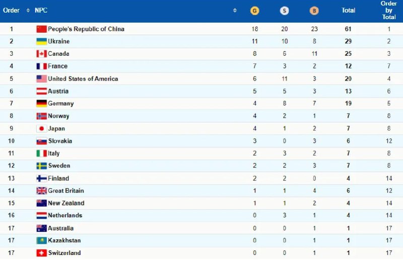 Українські спортсмени посіли друге місце, поступаючись лише Китаю. Із 78 комплектів нагород наші атлети здобули 29.