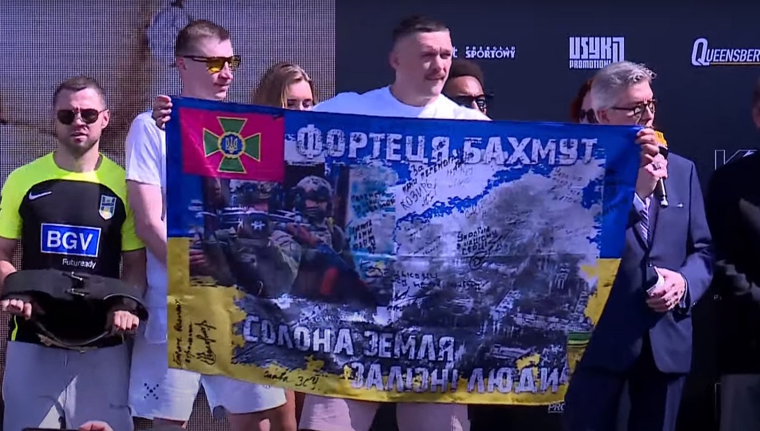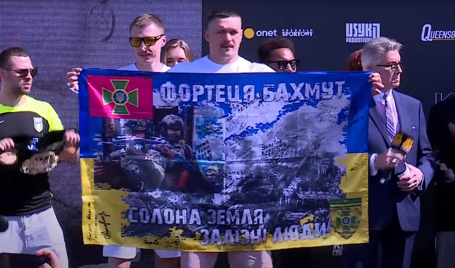 Як повідомляє "Апостроф", на церемонію зважування Усик прийшов із прапором України, на якому написано "Фортеця Бахмут. Солона земля, Залізні люди". Також на прапорі присутні фото та підписи героїв, які продовжують боротьбу з окупантами на Бахмутському напрямку.