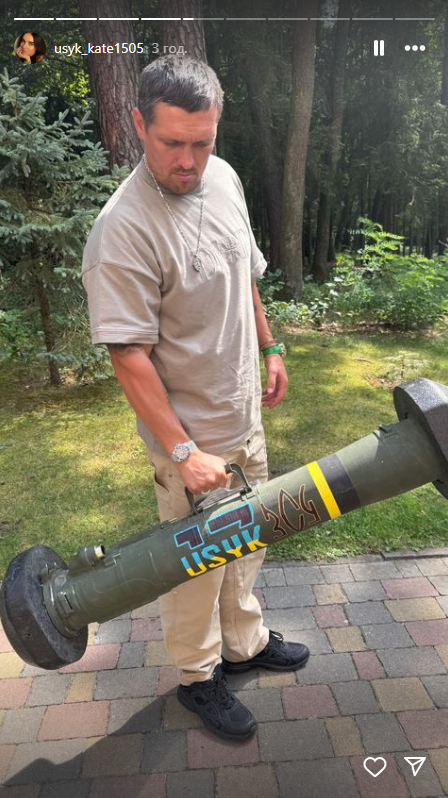 Дружина українського боксера Олександра Усика Катерина показала 2 фото в історіях. На одному з фото її чоловік тримає у руках легендарний Javelin.