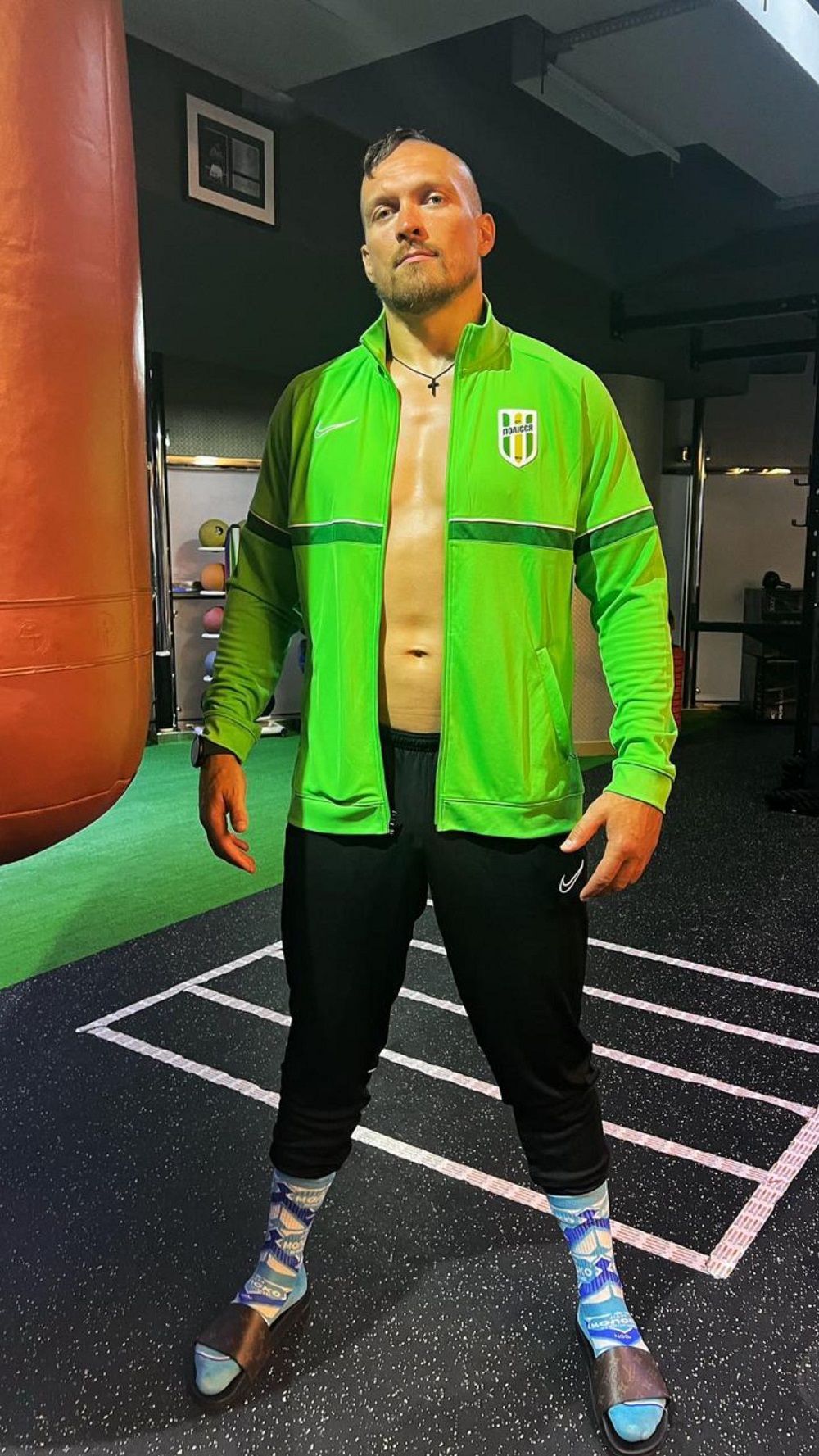 Олександр поділився фото, на якому стояв біля боксерської груші. Одягнений чемпіон був у кельму футбольного клубу "Полісся" з Житомира, за який він зіграв у товариському турнірі минулої зими, спортивні штани, шкарпетки оригінального вигляду та капці.