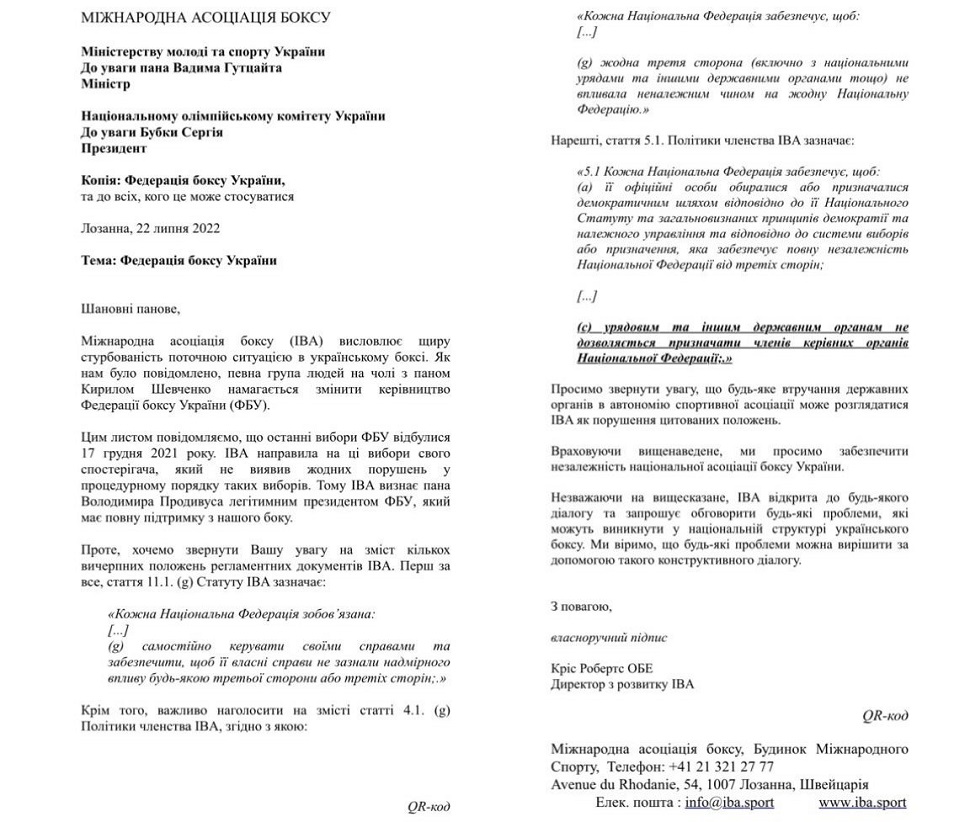У листі було зазначено, що будь-яке втручання державних органів в автономію спортивної асоціації може розглядатися IBA як порушення основних положень політики членства Національної Федерації.