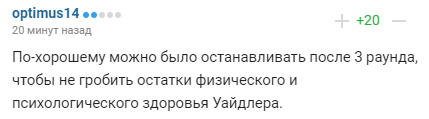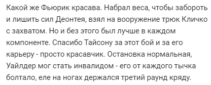 "Який же Фьюрік красава. Набрав ваги, щоб забороть і позбавити сил Деонтея, взяв на озброєння трюк Кличко з захопленням. Але і без цього був краще в кожному компоненті. Спасибі Тайсону за цей бій і за його кар'єру - просто красень. Зупинка нормальна, Вайлдер міг стати інвалідом - його від кожного стусана базікало, ледве на ногах тримався третій раунд поспіль", - пишуть користувачі.