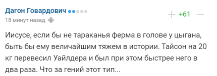 "Ісусе, якби не тарганяча ферма в голові у цигана, бути б йому найбільшим тяжем в історії. Тайсон на 20 кг переважив Вайлдера і був при цьому швидше нього в два рази. Що за геній цей тип ...".