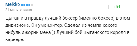 "Циган і в правду найкращий боксер (саме боксер) в цьому дивізіоні. Він розумний, хитрий. Зробив з чемпа якого-небудь Джорні міна)) Найкращий бій циганського короля в кар'єрі".