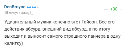 "Дивовижний мужик, звичайно, цей Тайсон. Всі його дії абсурд, зовнішній вигляд абсурд, а за підсумком виходить і виносить найстрашнішого панчера в одну хвіртку)".