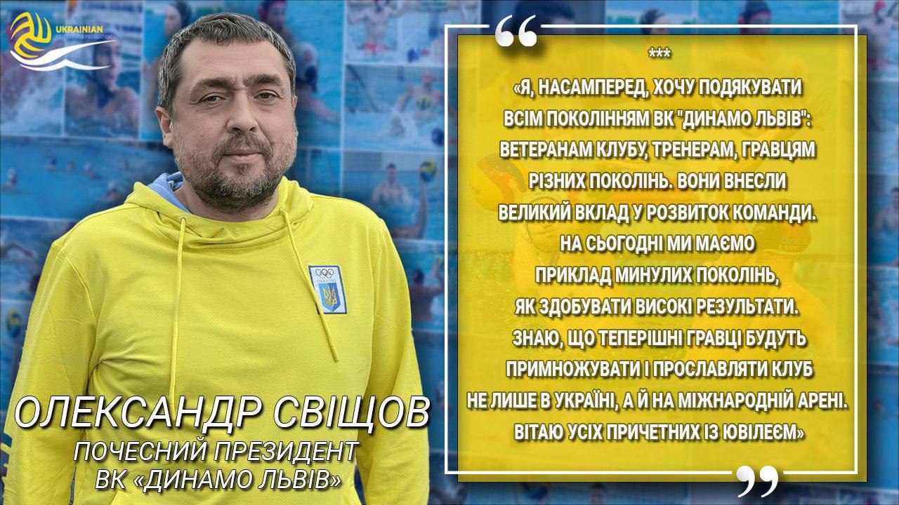 Олександр Свіщов, президент федерації водного поло України та почесний президент ВК "Динамо" Львів, поділився досягненнями клубу за роки його головування: 7 чемпіонських титулів, 8 Кубків України, 3 Суперкубки України, а також лідерство у Суперлізі сезону 2023/2024 та 7 поспіль титулів володаря Кубку. Він подякував усім поколінням "Динамо" за внесок та висловив віру, що теперішні гравці прославлять клуб як в Україні, так і на міжнародній арені.