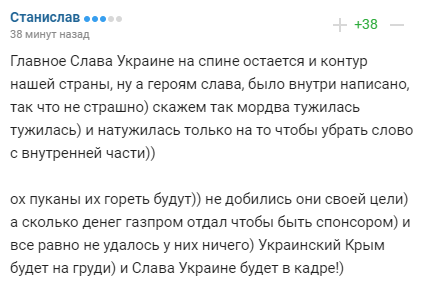 "Головне "Слава Україні" на спині залишається і контур нашої країни, ну а "Героям Слава", було всередині написано, так що не страшно) скажімо так мордва тужилась-тужилась) і напружилася тільки на те, щоб прибрати слово з внутрішньої частини) ) Ох пукани їх горіти будуть)) Не домоглися вони своєї мети) А скільки грошей "Газпром" віддав, щоб бути спонсором) і все одно не вдалося у них нічого) Український Крим буде на грудях) і "Слава Україні" буде в кадрі!)"