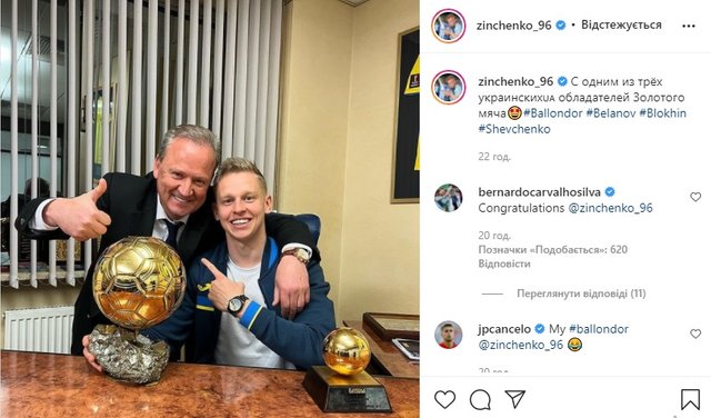 Згодом на фото відреагували одноклубники українця Бернарду Сілва та Жоау Канселу. Перший написав: "Вітаю". Другий взагалі заявив: "Мій "Золотий м'яч".