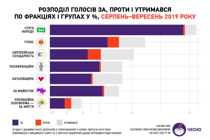 Цілком очікувано, найактивніше голосує фракція "Слуга народу". На другому місці йдуть нардепи фракції "Голос" (35%), депутатської групи "За майбутнє" (32%) і позафракційні народні обранці (30%).